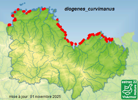 Clibanarius erythropus espèce rare en expansion dans le 22 milieu rocheux battu autour de mi-marée ![]() 2 pinces de taille semblable aux "doigts" rouges et bleu clair, yeux noirs avec des petits points blancs ![]() Les trois premières observations concernaient des individus isolés, mais la découverte par Gilles Bentz et Antonin Goubard de plus de cent individus de tailles différentes répartis dans deux mares de l'Ile Grande, en février 2021, a mis en évidence la reproduction de cette espèce dans notre département. Plus récemment, d'autres observations de groupes d'individus ont été faites, d'abord proches de cette station (de Locquémeau à Perros -Guirec), puis un peu plus éloignées (Sillon du Talbert en novembre 2023). en savoir plus : DORIS, Clibanarius erythropus (Latreille, 1818), https://doris.ffessm.fr/ref/specie/748 et aussi : https://inpn.mnhn.fr/espece/cd_nom/18462/tab/fiche Carte de présence dans le 22