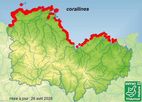 Melobesia membranacea forme une croûte parsemée de conceptacles, sur algue, infralittoral ![]() en savoir plus : https://www.habitas.org.uk/marinelife/species.asp?item=ZM4720 Carte de présence dans le 22