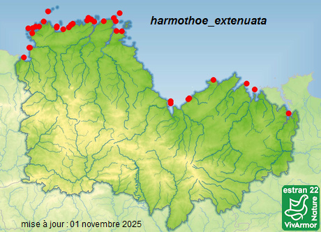![]() une tache brune à la base de chaque cirre dorsale ▲ tête avec 2 paires de tentacules, 4 antennes ▲ en savoir plus : sur Linnaeus Carte de présence dans le 22